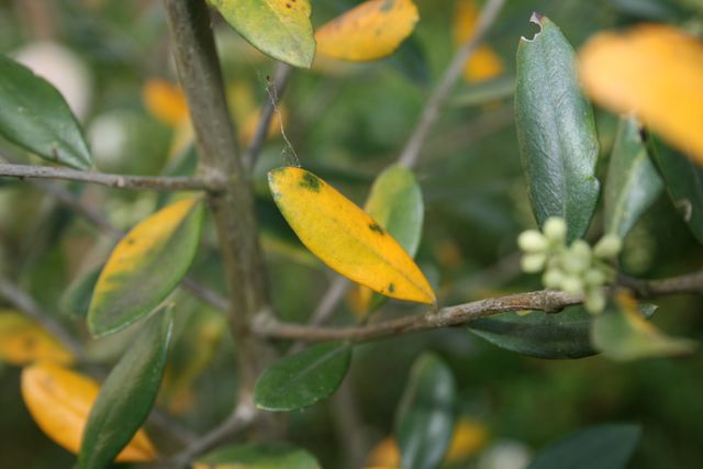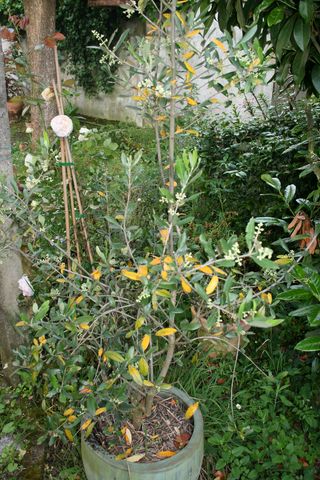 Actuellement les oliviers se débarrassent de leur vieillent feuilles pour en faire de nouvelles. Je crois voir une grappe de fleur c'est qu'il ne va pas si mal.