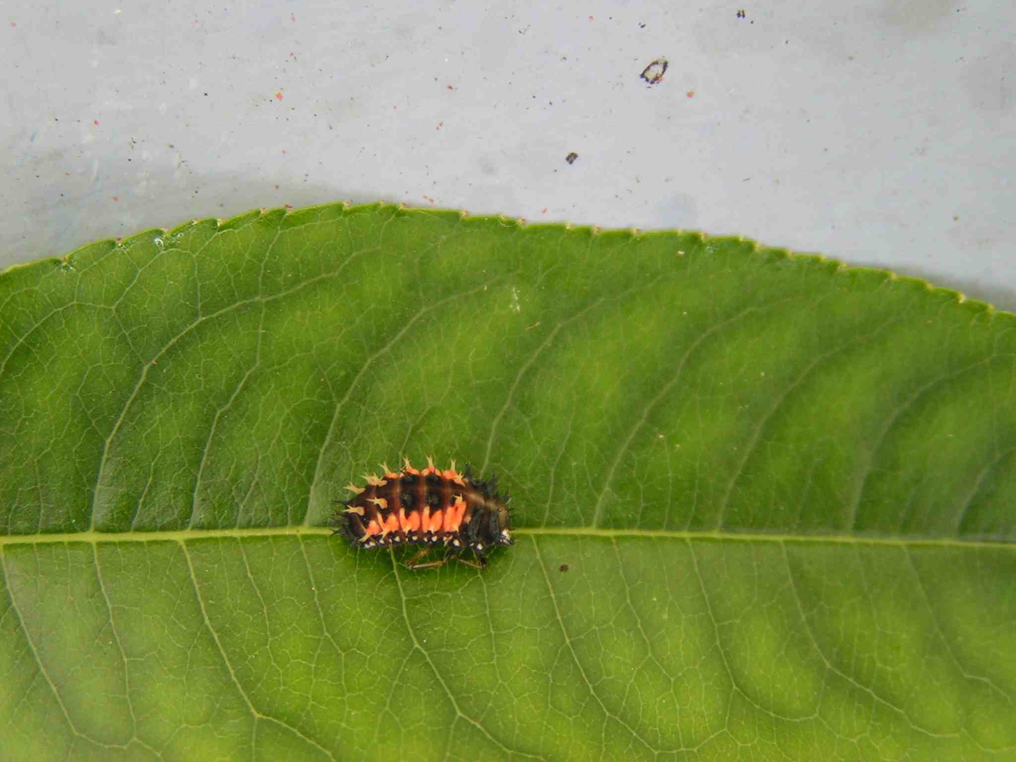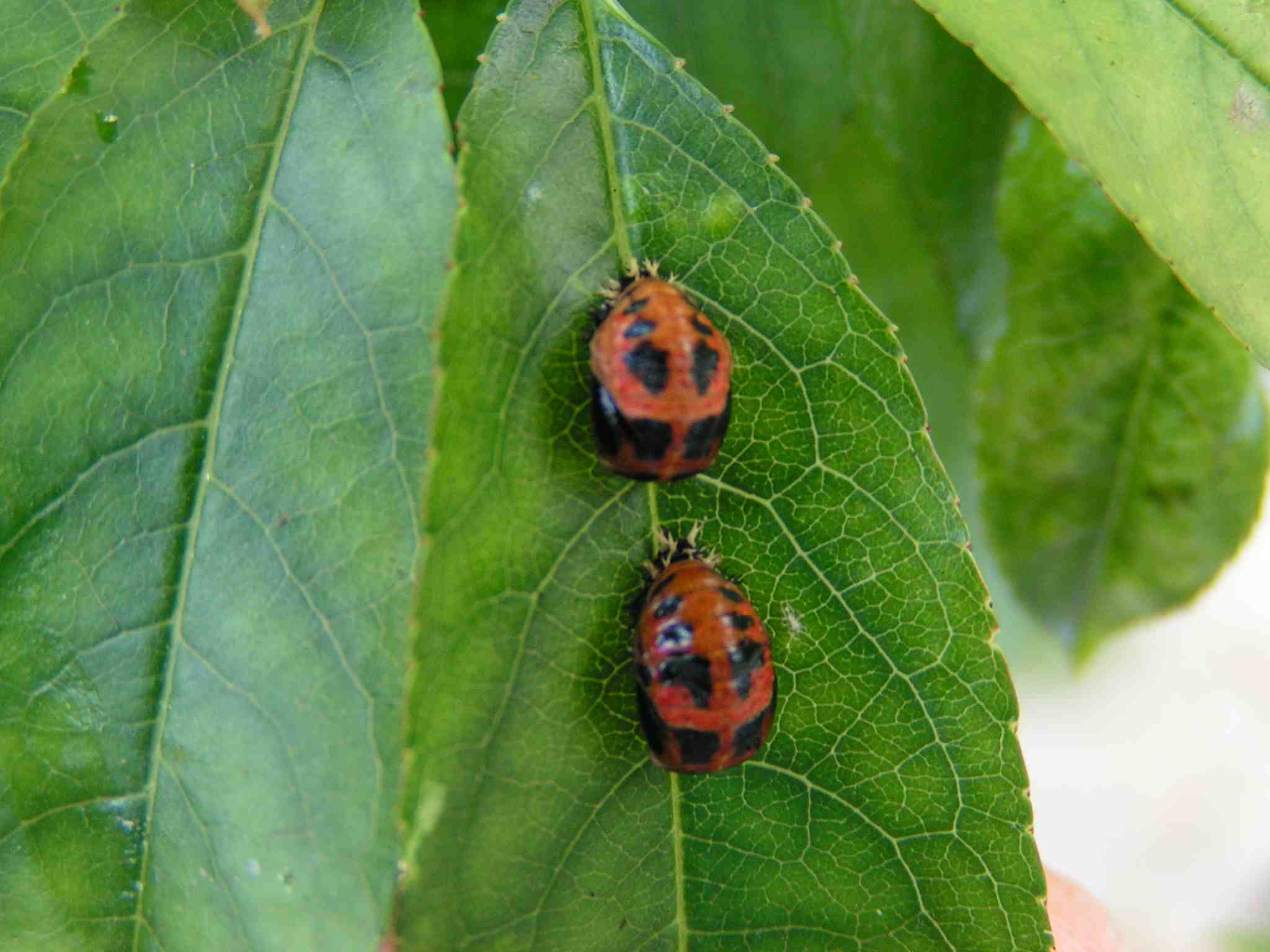 Il ressemble à un tique, la couleur en plus et au lieu de sucer le sang des mammifères, il broute les feuilles de mon pêcher ! Il a une ventouse ou une bouche-ventouse, un énorme abdomen. Il est rouge avec des taches noires. Sa larve a un vague air de famille avec celle de la coccinelle. La larve se déplace mais je ne vois pas l'adulte bouger. Il est scotché à la feuille par sa ventouse. Ses pattes, si c'en sont, sont tout près de la bouche ventouse.