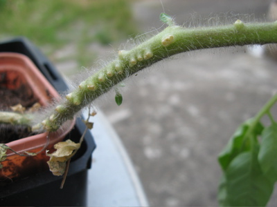 Je ne sais pas si l'envoi de la photo marchera, mais j'ai ces bubons berks qui sont apparus sur les pieds de tomates (qui sont encore en pots), ce sont des tomates bios de Ste Marthe. a priori ça doit être de petits parasites, non? ou une maladie. M'enfin je me demande quoi faire. ça se soigne, docteur?
