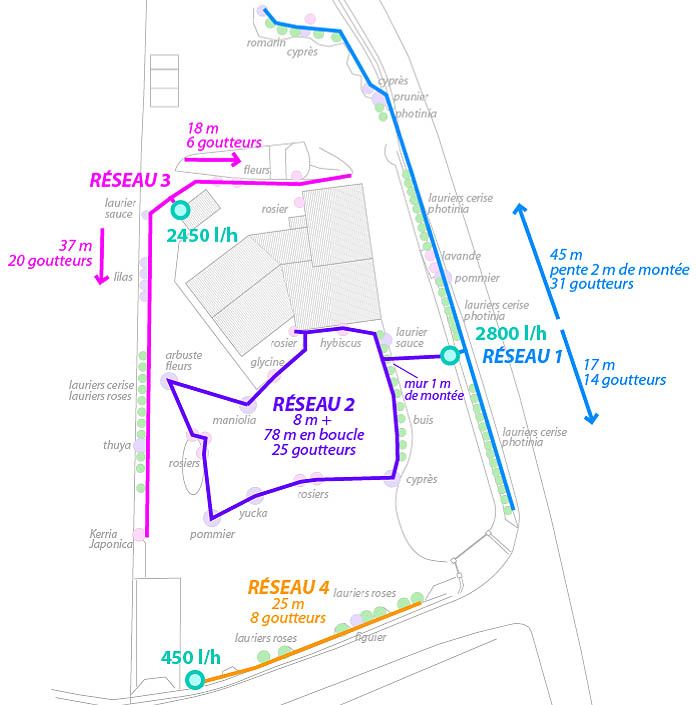 Je souhaite installer un goutte à goutte pour des haies, fleurs, arbustes... (voir dessin joint) Les réseaux 1, 2 et 3 seront équipés d'un programmateur de robinet chacun et 1 réducteur de pression/filtre chacun.