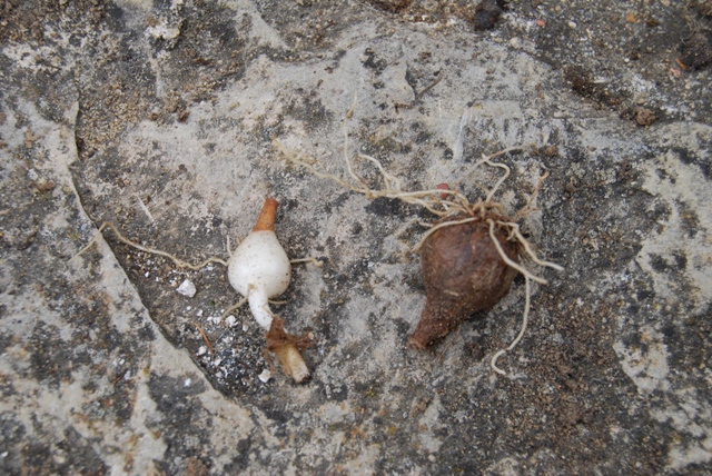 On voit qu'il était trop profondément enterré (probablement de la terre a été ajouté sur leur emplacement). C'est pourquoi le bulbe s'est reformé quelques centimètres plus haut, au sommet d'une tige blanche visible sous le petit bulbe à gauche. Ce phénomêne est connu chez perce-neige et nivéole, mais probablement aussi chez d'autres genre de la famille.
