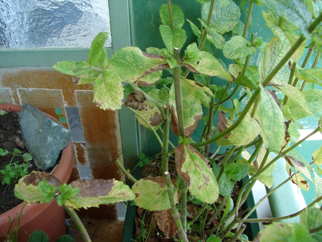 Mon beau pied de courge pour lequel j'ai ramené des bouses de vaches dans mon sac à dos souffre depuis 2 semaines d'un mal qui lui racornit les feuilles. Il a refilé ça à la menthe qui est contre lui et, je pense au calendula qui est à env 1,5 mètres (largeur de mon balcon...)