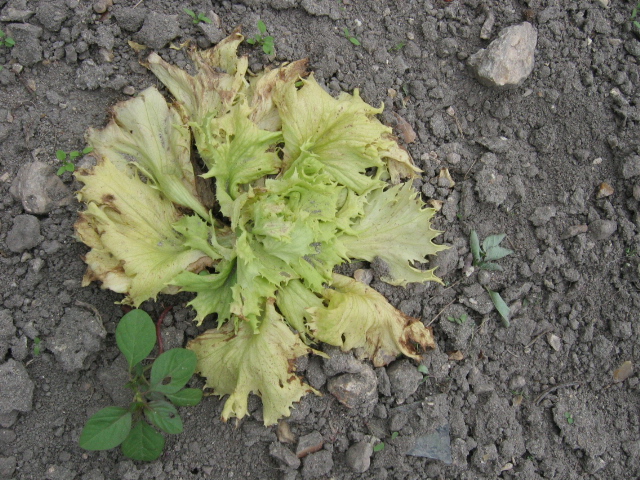 chaque année durant l'été, mes salades dépérissent par une écoloration des feuilles inférieures, puis apparition de tâches brunes, puis déssèchement total de ces feuilles. Subsistent seulement quelques feuilles vertes du coeur. Les racines paraissent correctes, sans parasites ni insectes apparants sur les feuilles ;