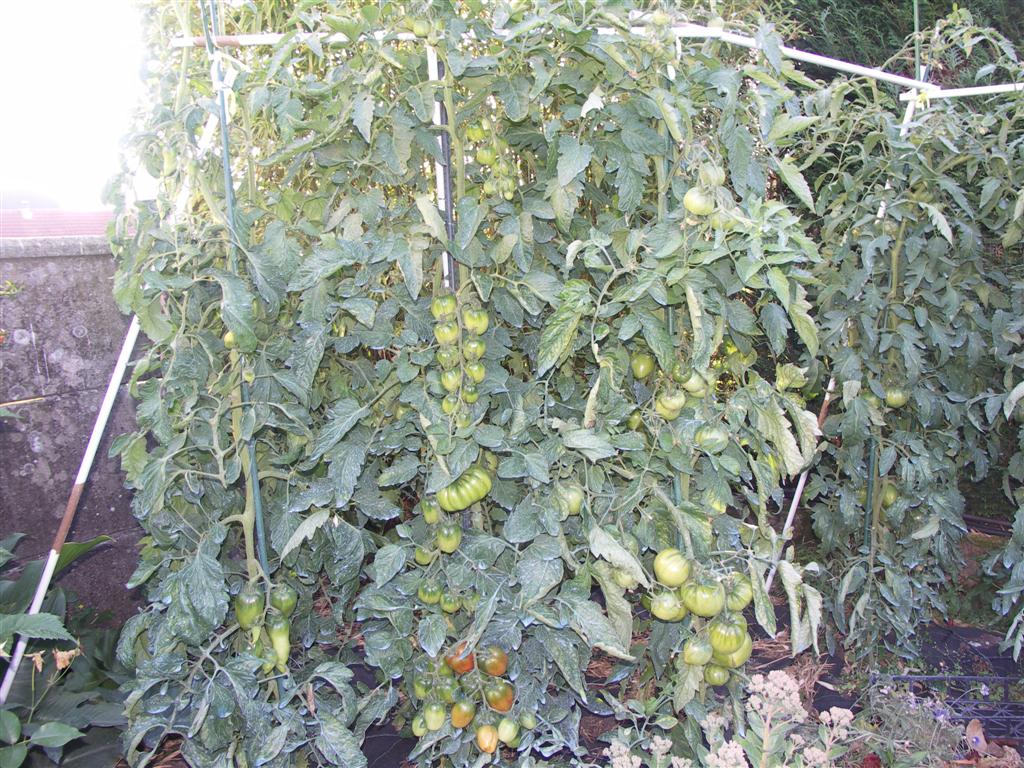 Donc, en conclusion, j'ai des pieds certes très fournis en feuilles, mais aussi en tomates, de taille tout à fait acceptable. Et malgré l'ombre des feuilles, elles commencent à murir... alors je pense que je vais garder cette technique.