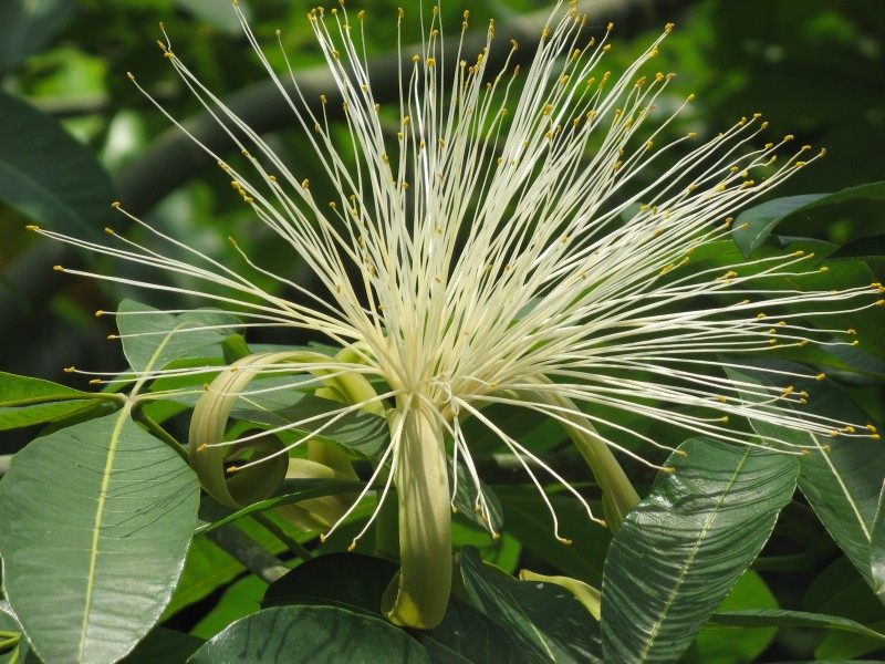 Je pense à la fleur d'un Pachira, de la famille des Bombacaceae (baobab, fromagier, etc.). Y a-t-il des fruits en forme de grosse noix sur l'arbre ? Le tronc est-il élargi vers le bas ?