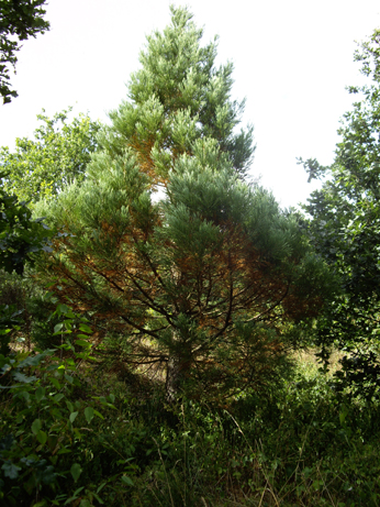 est-ce seulement chez moi ou bien d'autres jardiniers de Normandie (sud de l'Eure) ont-ils constaté le même phénomène chez eux : les arbres tombent malades les uns après les autres. depuis le début de l'été, j'ai eu à déplorer le feu bactérien sur un tremble (désormais abattu), le dépérissement d'un noisetier, le jaunissemetn d'un jeune cyprès de l'Arizonale brunissement rapide et suspect d'un conifère non identifié mais magnifique (photos 1), l'assèchement des feuilles supérieures sur un châtaignier planté à l'automne dernier, qui présente néanmoins des jeunes pousses et des bourgeons, mais aussi des taches suspectes au pied (photos 2 et 3 ).