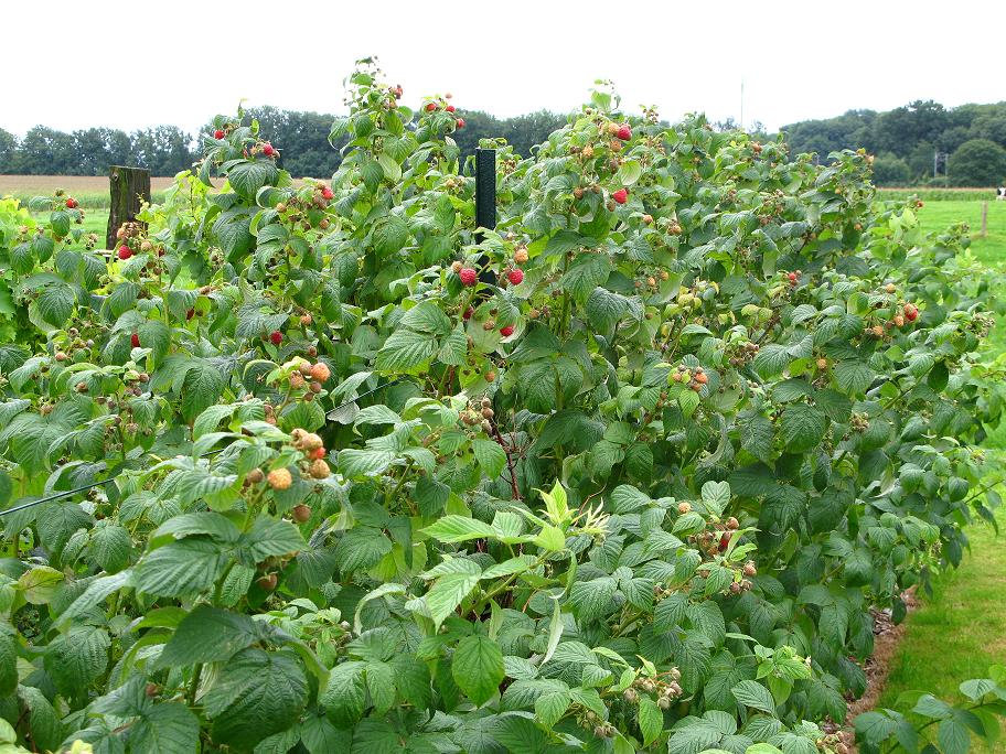 Je n'ai pas palissé les miens cette année, ce sont des remontants (11 variétés). La variété qui a le plus fort développement chez moi est 'Polka'. L'année prochaine je tendrai deux fils de fer entre les poteaux déjà en place.