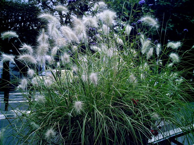Je pense à un pennisetum (herbe aux écouvillons), mais je ne sais pas précisement lequel.