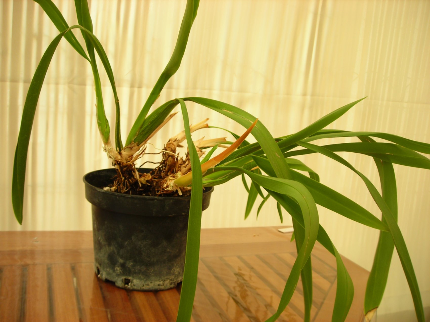 -Elle a de longues feuilles, fines (un peu comme les iris) qui se détachent à environ 5cm de la base.