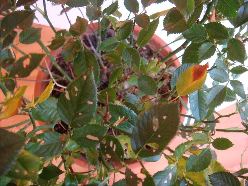 Il y a queques temps j'ai remarqué des feuilles abimées que j'avais enlevées, mais c'est de pire en pire! Certaines feuilles jaunissent, puis tombent. D'autres feuilles ont des trous. Voire Les deux en même temps. Je n'ai rien remarqué de suspect sous les feuilles.
